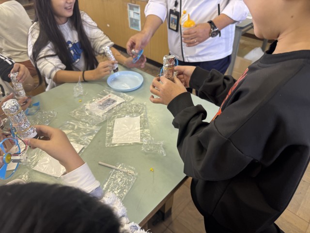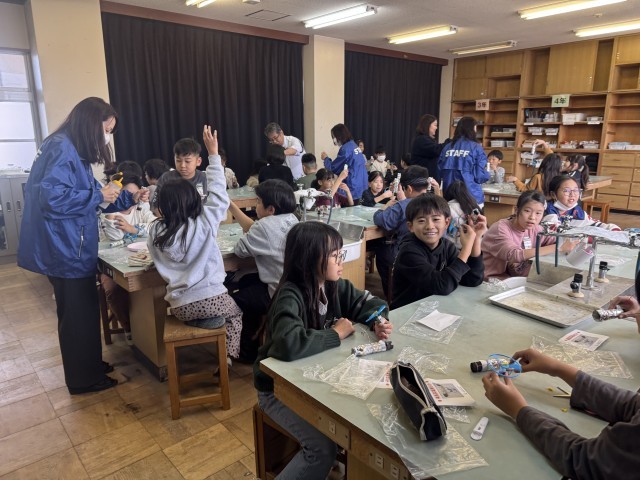 4年生は、電気教室として関西電気保安協会の方々とパナソニックの方々を招いて実験や工作を行いました。あかりのエコ教室では、白熱灯と蛍光灯とLED(発光ダイオード)を力を合わせて光らせ、使う電気の量を比べました。熱に使わず光にのみ電気の力を使う無駄のない器具が長持ちすることが分かりました。ごみが減る3R(スリーアール)、リデュース、リユース、リサイクルの学習を思い出しながら実験を行いました。また、備長炭とアルミホイルを使って手作り電池を作ったときは、食塩水と備長炭とアルミホイルが反応して、モーターが回る様子にとても驚いていました。