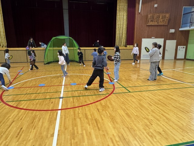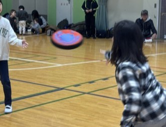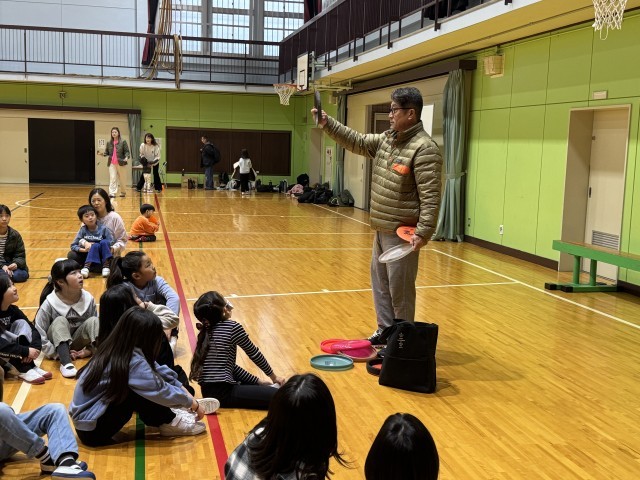 冬休みも、子どもたちに体育館でしっかりと運動してもらおうとPTAの皆さんがドッチビーを企画してくれました。子どもたち40名とおうちの方10名が来てくれてみんなで楽しみました。教えてくれるのはフリスビーやアルティメットをされている近畿大学の大島さんです。始めにフリスビーの歴史についてお話を聞き、体操をしてキャッチから練習をしました。そして走りながらパスをしたり、ゴールに向かってドッチビーを投げたりしました。次に大島さんがディフェンスをしてくれて、だんだんとすることが難しくなっていきますが、子どもたちはどんどん上手くなっていきました。最後にチームを作ってゲームを行いました。あっという間の2時間でした。