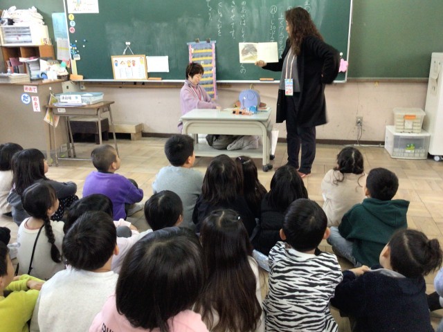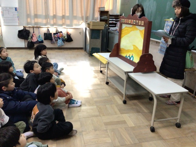 今年もレインボールームの皆さんによる読み聞かせがありました。絵本を読んでくれたり、とても大きな紙芝居を読んでくれたりしました。朝のお忙しい時間帯に、子どもたちのために時間を作っていただいて本当にありがとうございます。これからもよろしくお願いします。