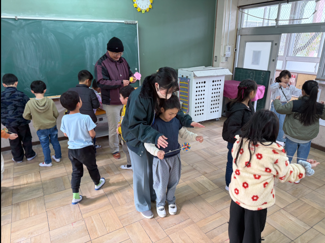 ハート交流館の方々が1年生の教室や体育館に来てくれて、いろいろな形のこまやきれいな色のついたぶんぶんごまの回し方の見本を見せてくれたり、一緒に回して遊んだりしました。けん玉の技も教えてもらい、1年生たちは昔遊びを楽しみました。