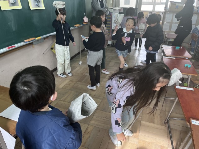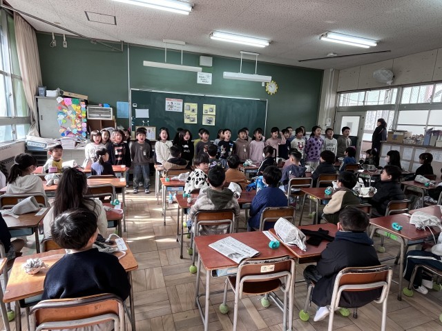 新1年生と保護者の方々が、中央小学校の体育館に集まってくれました。保護者のみなさまは、入学に向けたお話を聞き、新1年生の子どもたちは、1年生の教室に行き、小学校の机といすに座って小学校生活を体験することができました。元気な声で校歌を歌っている1年生の様子を見ていたり、新聞紙を使って、一緒に手作りけん玉を作って楽しみました。4月になると小学生になるみなさんを楽しみにして待っています。