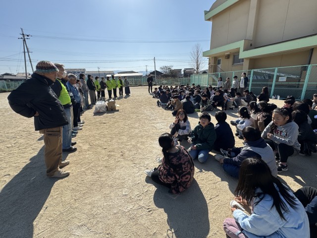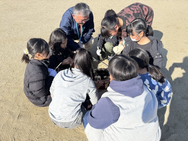 現代の便利な暮らししか知らない子どもたちが、社会の学習で少し昔のくらしについて学習しました。洗濯や料理、お掃除など今と昔とでは大きく違います。今はとても便利なものがたくさんあって、良かったと思ったり、昔の道具をさわるのは少しドキドキしたりしました。この日は、地域の方々や保護者の方々が20人くらい小学校に来てくれて、マッチをすって炭に火をつける体験をしました。七輪の中に新聞紙をちぎって丸めたものや、消し炭や割り箸を負ったものを敷いて、炭をのせてマッチで火をつけます。これがなかなかうまくいかない。でもあきらめずにどのグループも何度も何度もマッチをすっていくと、炎と煙が出てきました。しっかりと火がつくまで風を送るのに、うちわを使ってあおぎました。すると火吹き竹を持ってきてくれた地域の方が、「これで吹いてみ。」と言って火吹き竹を貸してくれました。だんだんと火と煙が落ち着いてきて、次は餅を焼きます。火加減をどうしたらいいか考えて、焦げないように少し火から離すといいことを教わりながら焼きました。うまくきつね色に焼けた子や真っ黒に焦げてしまった子もいました。それでも、もっと焼いて食べたいと言っていました。