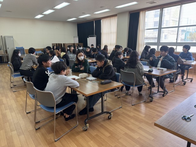 運動場のイチョウの木の枝を剪定したときに、庁務員さんが輪切りにしてひもを通す穴をあけてくれたものを使って、木のキーホルダー作りをしました。そして、班に一人ずつPTAや地域の方々が入って、お話し会も行いました。将来の夢や小学校で一番おいしかった給食メニュー、中学校へいったらどんなことをしたいかなど、子どもたちだけでなく大人の人も入ってお話しが進んでいき1時間はあっという間でした。