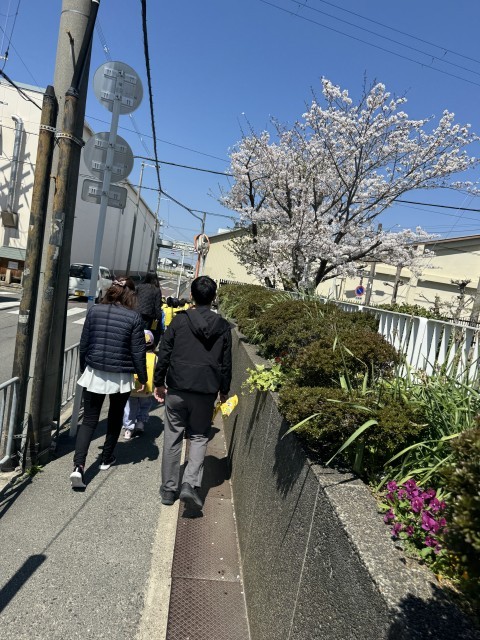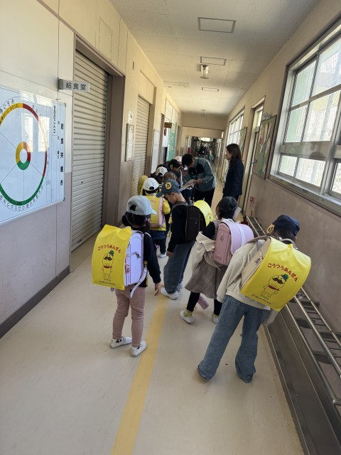 1年生の下校は、道や一緒に帰るなかまを覚えて集団で帰ります。先生たちもついていき、見守ります。交差点を安全にわたるようにであったり、細い道では溝に落ちないようにであったりするような注意するところを覚えながら帰ります。コースで並ぶのもできるだけ早くできるように頑張っています。