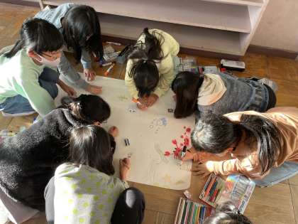 今日のクラブ活動でイラストクラブが学年別に大きな絵を描いていました。テーマや内容を話し合って制作を進めています。来月のクラブで完成し、校内に掲示する予定です。