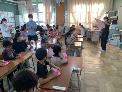 zoomを使って、おりづるのたびという絵本の読み聞かせをし、その後、各学級に六年生が別れて行き、鶴の折り方を説明してくれました。