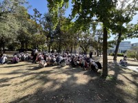 平和の灯前で集合写真を撮り、聴き取り学習へと向かいます。