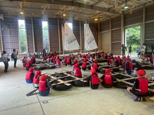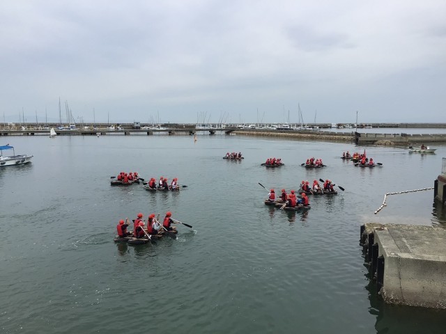 ゴムのチューブ、板、ロープを使って自分たちでいかだを組み上げました。そして、そのいかだで海に出ていき、ゲームを楽しみました。