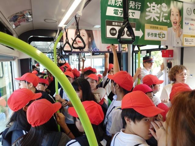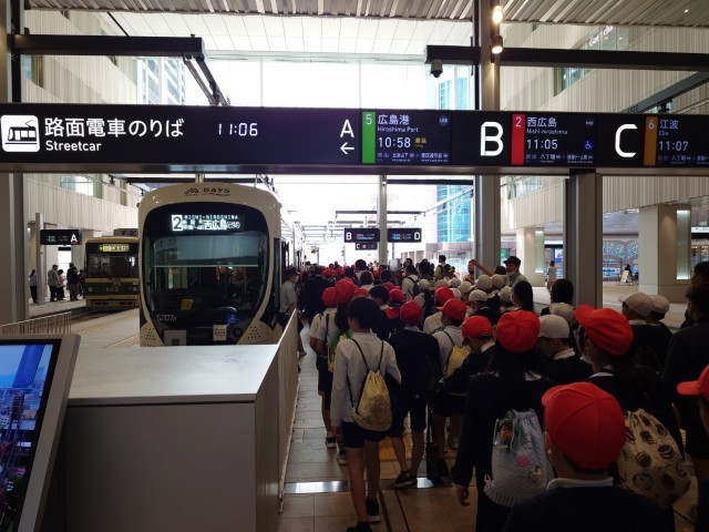 予定通り広島駅に到着、大きな荷物を預けてから、広電へ。今年の8月にリニューアルした広電乗場は乗り込み易くなりました。ただ、予想してましたが、他校もたくさん来ていますので、電車は激混みです。