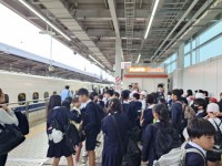 原爆ドーム前に到着、平和公園内で人数点呼の後、一度爆心地である島病院を見学し、公園内に戻って、原爆ドームをバックに記念撮影です。