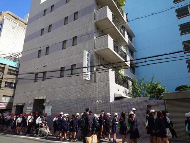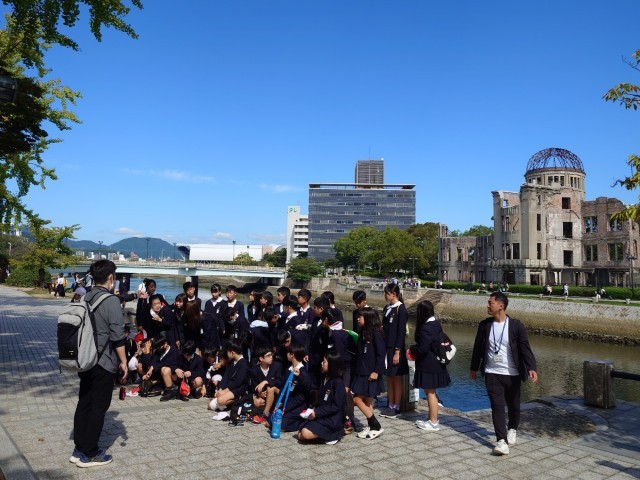原爆ドーム前に到着、平和公園内で人数点呼の後、一度爆心地である島病院を見学し、公園内に戻って、原爆ドームをバックに記念撮影です。