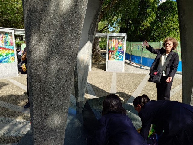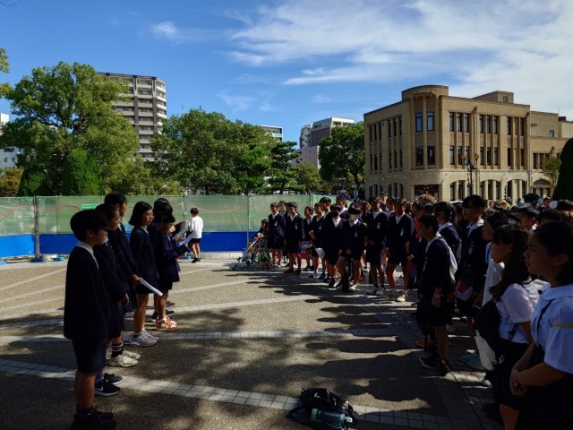 記念撮影の後、原爆の子の像の前で慰霊祭を行いました。1年生から5年生も一緒に折った千羽鶴を捧げました。