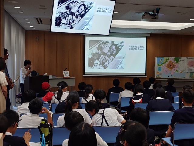 昼食後、13時より、被爆伝承者(被爆された方がご高齢のため、代わりに話をしてくれる方)の話を聞き取りました。移動中など、機器を操作できないため、配信と時間差ができることをご了承ください。