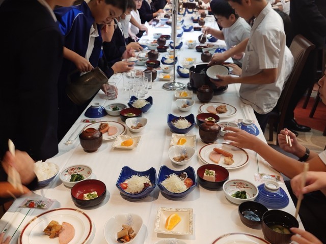 朝の準備の後は朝食です。健康チェックをしましたが、特に体調の悪い児童はいませんでした。全員元気に宮島に行けそうです。