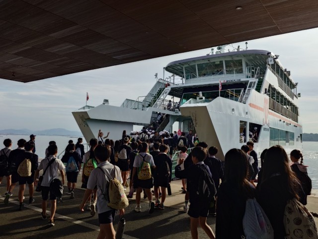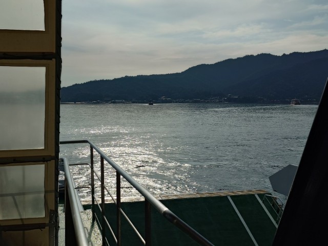 ホテルを出発、宮島口桟橋まで徒歩で移動します。カーフェリーに乗り込みます。まだ出発前ですが、フェリーからすでに宮島が見えています。