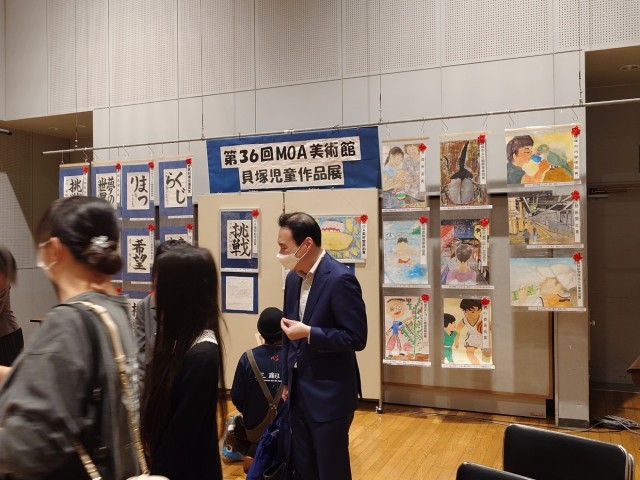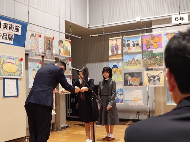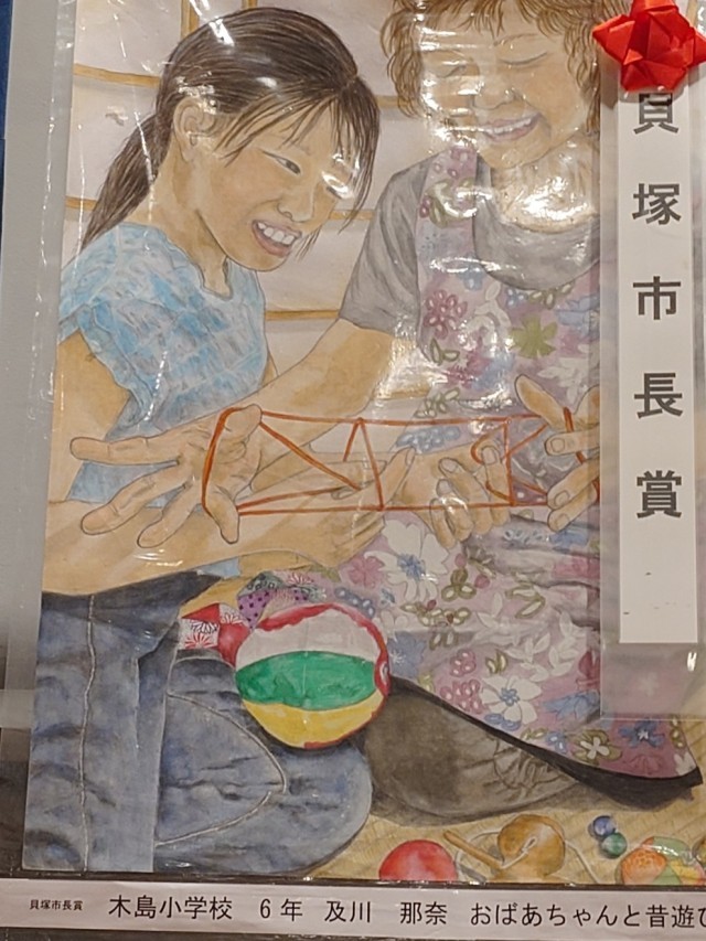 16日にMOA美術館貝塚児童作品展の表彰式がコスモスシアター小ホールで開催されました。そこで、本校の6年生、及川那奈さんが貝塚市長賞に輝きました。おばあちゃんとあやとりをしているところを表現豊かに、ふたりのあたたかい心が現れるように描きあげた見事な作品でした。