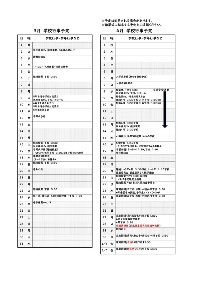令和8年度4月行事予定の一部訂正です。4/28と5/1、5/7の日程、家庭訪問の地区が変更となっています。