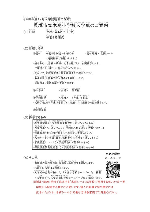 令和8年度 新1年生 入学式案内
