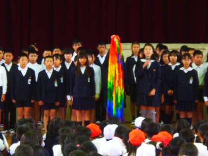 10月22日(火)修学旅行 行ってきますの集会がありました。原爆の子の像の前でするセレモニー(言葉と歌)を1〜5年生が見ました。6年生は24、25日に修学旅行に行ってきます。