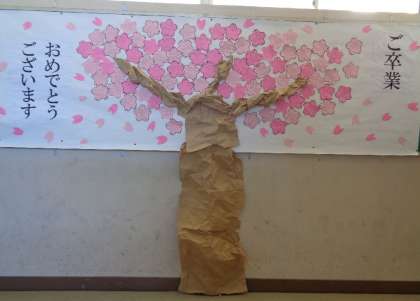 A棟の階段の踊り場に、2年生から6年生への「卒業おめでとう」のメッセージが飾られています。