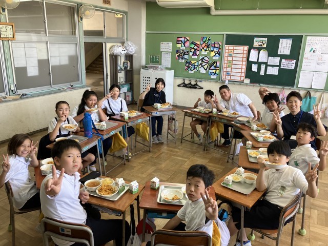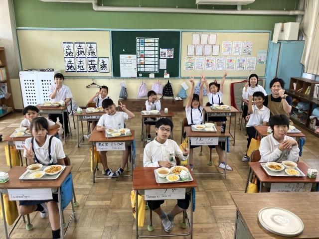 永寿小学校には自校の給食室がなく、毎日、葛城小学校で作られた温かい給食を届けていただいています。子どもたちは、笑顔いっぱいで調理員さんとお話ししながら、楽しい時間を過ごしていました。