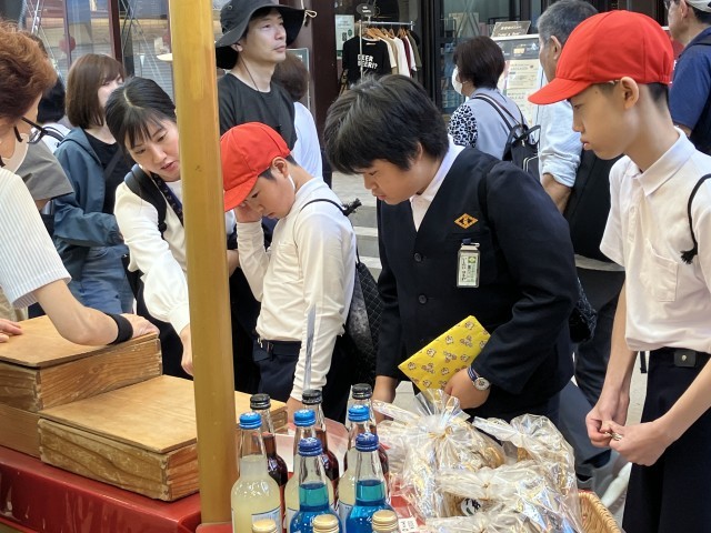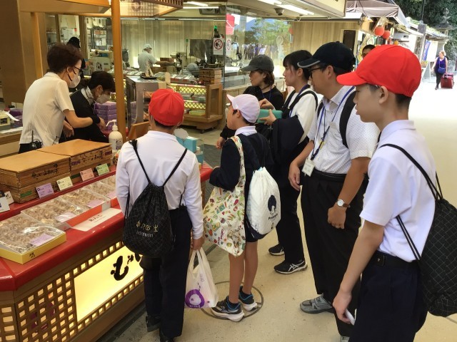 神社のそば、表参道商店街でお土産の買い物をしました。お家の人へのお土産を選びながら、買ったものをその場で食べるのもOKでしたので、もみじまんじゅうなどを食べたりしました。お家の人の喜ぶ顔を思い浮かべながらお土産を選んでいたことでしょう。お楽しみに待っていてください!