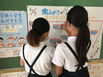 本日の給食後は、どの学年も歯みがきを頑張る子どもたちの姿が見られました。「1つの歯、20回磨くねん!」「ちょっとへこんでる歯は、歯ブラシを縦に持って磨いたで!」と、学習したことを実践していました。
