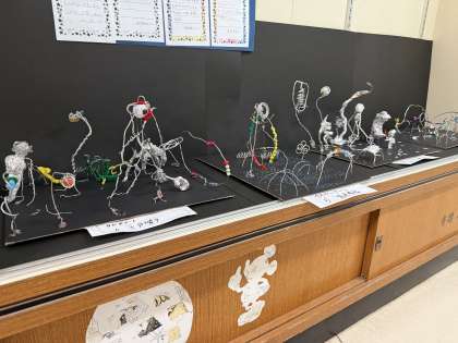 5年生が図工の時間に、ワイヤーやアルミホイルを使って「宇宙の世界」を作りました。大きな生き物や小さなロボット、不思議な風景が広がる、想像力あふれる作品です。