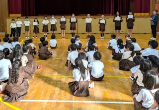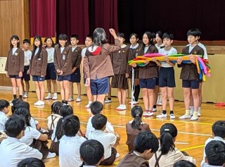 折り鶴を折ってくれた下級生や地域のみなさまへの感謝の言葉と共に、平和記念公園で捧げる際の歌「折り鶴」と平和への言葉をどうどうと発表しました。そして、「行って来ます。」と発表をしめくくりました。今週金曜日、無事に旅立てることを祈ります。