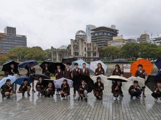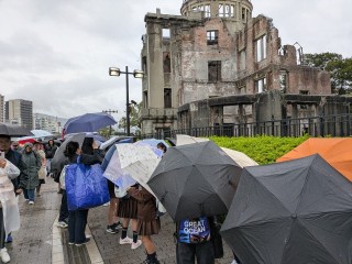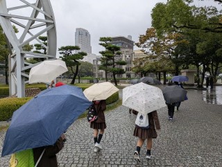 原爆ドームに着きました。雨ですが、これから碑めぐりをピースボランティアの方にしていただきます。