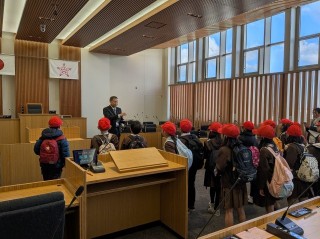 水間鉄道に乗って、市内めぐりに行きました。市役所では議場を見せていただいて、マイクも使わせてもらいました。