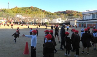 今朝の集会は全校での「みんな遊び」を児童委員会が企画して、けいどろをしました。