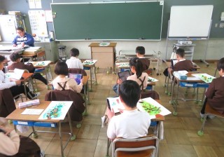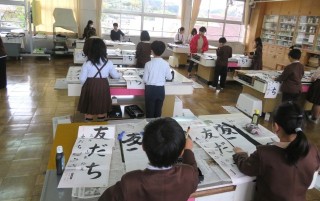 3年生は毛筆の文字を一文字ずつていねいに練習していました。