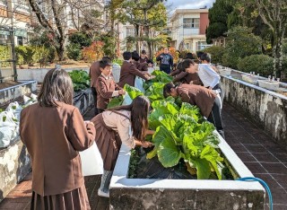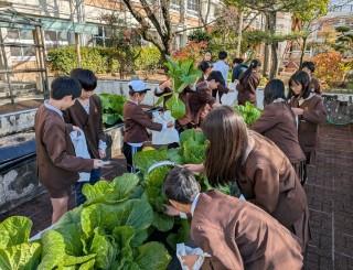 6年生が白菜の収穫をしました。大きく立派に育っています。お家でおいしくお召し上がりください。