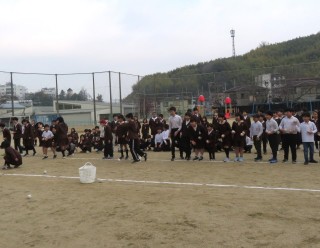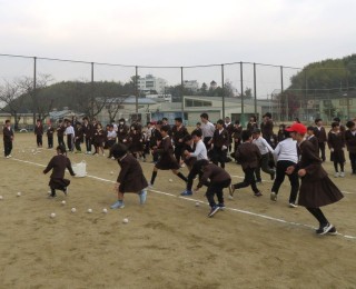 寒い日の健康づくりのために、今朝は保健委員会が考えた「移動玉入れ」大会をしました。