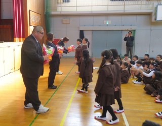離任式では今年度で去られる先生の紹介があり、一人ずつ挨拶がありました。お別れはさびしいですが、みんなから拍手と花束が贈られました。