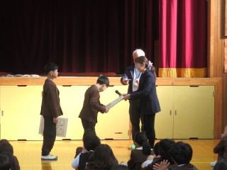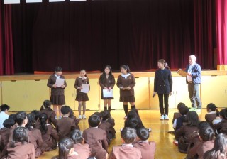 修了式ではお話の後、交通安全の図画と作文の表彰をしました。