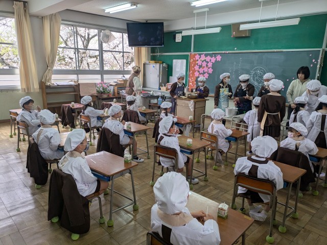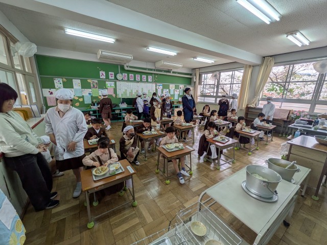 給食が始まりました。4/9(木)のメニューは『カレーライス・フルーツコンポート・福神漬け』でした。この写真は1年生の給食の様子です。6年生のフォローのもと、みんなで楽しく食事することができました。応援していただいたみなさん、おつかれさまでした。ちなみに本日のメニューは『菜めし・鶏肉とじゃがいもの炒め煮・豆腐の味噌汁』です。今日も引き続き、よろしくお願いします。