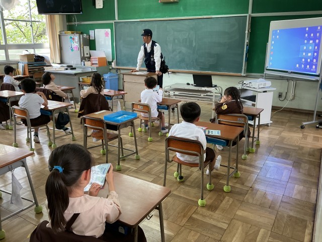 貝塚警察の方に来ていただき、お話や動画などを通して、交通安全について学びました。今回は座学中心でしたが、近日中に実技での学びも行う予定です。みんなで交通ルールを守り、安全に過ごせるといいですね。