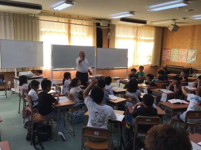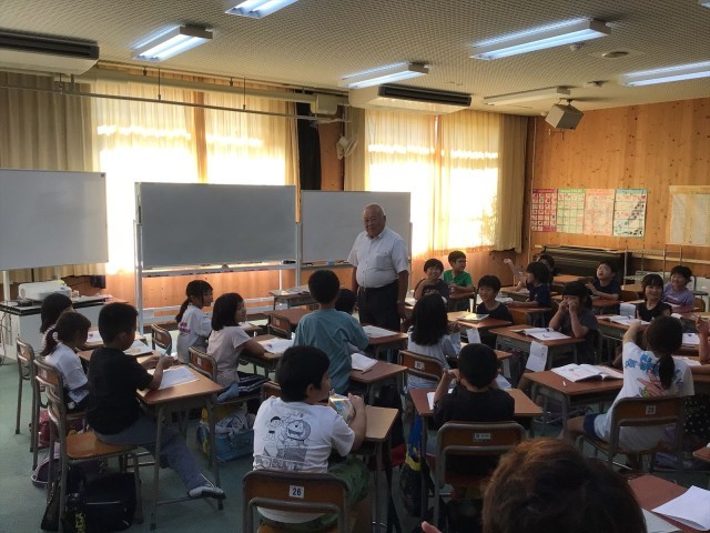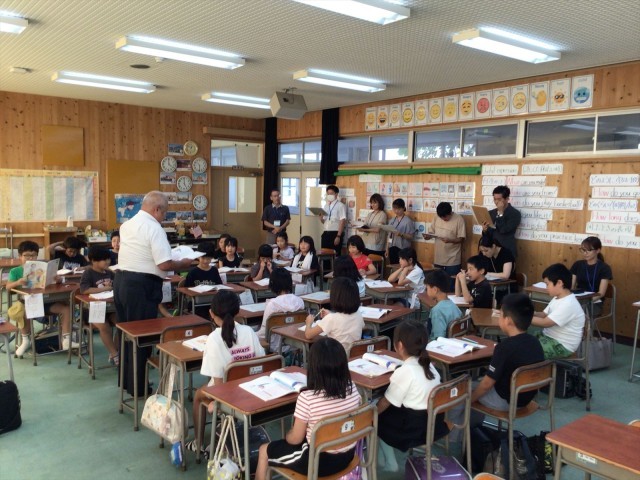 今日はイングリッシュルームで道徳の授業を行いました。元龍谷大学教授の牧﨑幸夫先生が「雨ふり」という教材を使って授業をしてくれました。また、貝塚市内の小中学校からたくさんの先生が授業を見に来てくれました。子どもたちは積極的に手を挙げて発言したり、牧﨑先生の音読に続けてすぐにお話を読み出したりするなど、とてもがんばっていました。