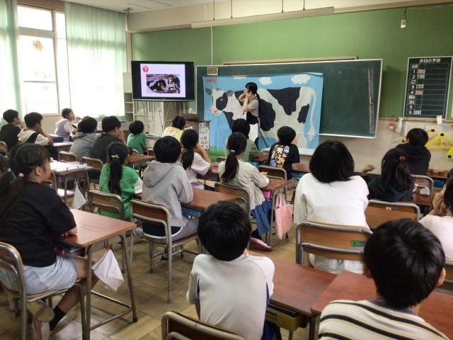 今回のテーマは「乳牛について」。子どもたちは、乳牛の一生や牛乳ができるまでの過程を学び、命の大切さや食のつながりについて考えることができました。様々なイラストやお話を通して、子どもたちは身近な食材の一つである牛乳のことや、牛乳を届ける方々の努力にも関心を深める良い機会となりました。