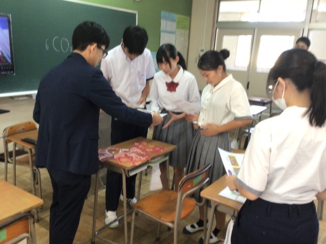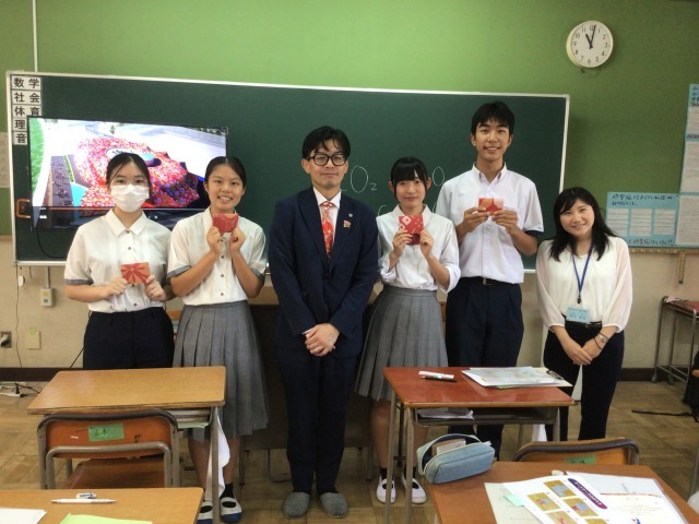 8年生の1つのグループの生徒たちが、関西万博のパビリオン「飯田グループ×大阪公立大学 共同出展館」の館長からお話を聞きました。実際にパビリオンの屋根に使用された西陣織の端材を使って作るカードケースをいただいた生徒たちは大興奮でした。昨日、関西万博が閉幕し、その翌日という大変忙しい中、二色学園の8年生の取り組みにご協力いただき本当にありがとうございました。