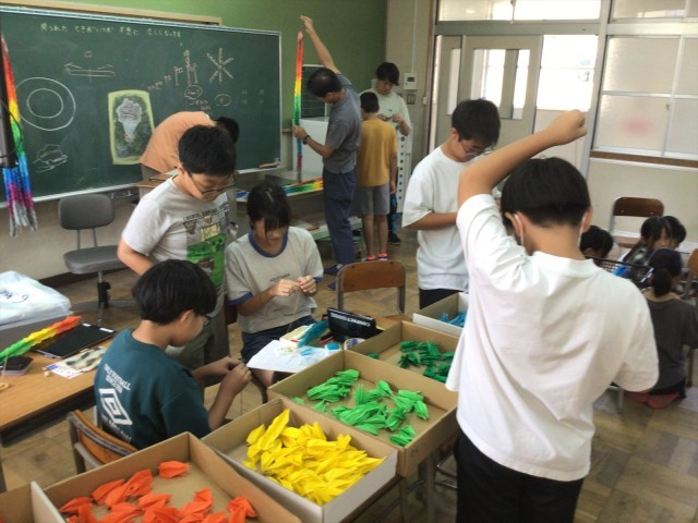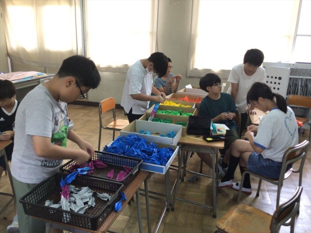 10月22日・23日のヒロシマ修学旅行に向けて、千羽鶴を作成していました。6年生の子どもたちは、1年生から9年生の各教室で折り鶴の作成を依頼し、折り紙に平和へのメッセージを書いて鶴を折ってもらいました。今日はクラスみんなで力を合わせて、心を込めて鶴に糸を通していました。子どもたちが協力し、「次にできること」を率先して見つけて自分から動く子どもたちの姿が印象的でした。