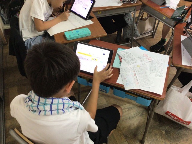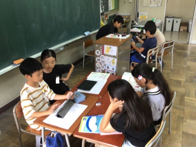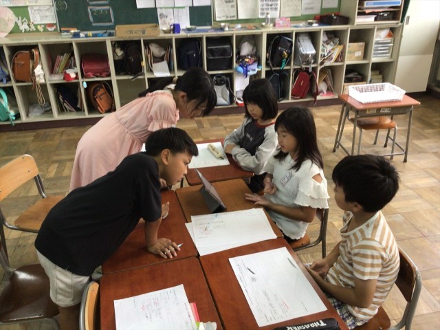 5時間めの学習の様子です。子どもたちは環境についての学習の一環で、「地球にやさしいこと」について考えています。今日は調べ学習やまとめる活動を進めていました。また、詳しく知りたいことや疑問について、地域の方や企業の方、市役所の方に教えていただくために、職員室の電話でアポイントの依頼をしていました。了承してもらえた子どもたちは嬉しそうな表情やほっとした表情で教室に戻ってきました。