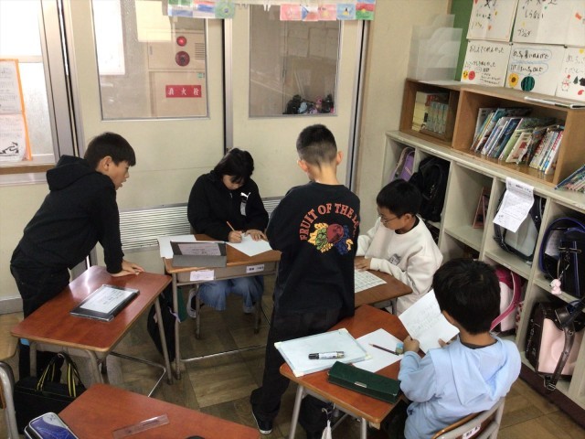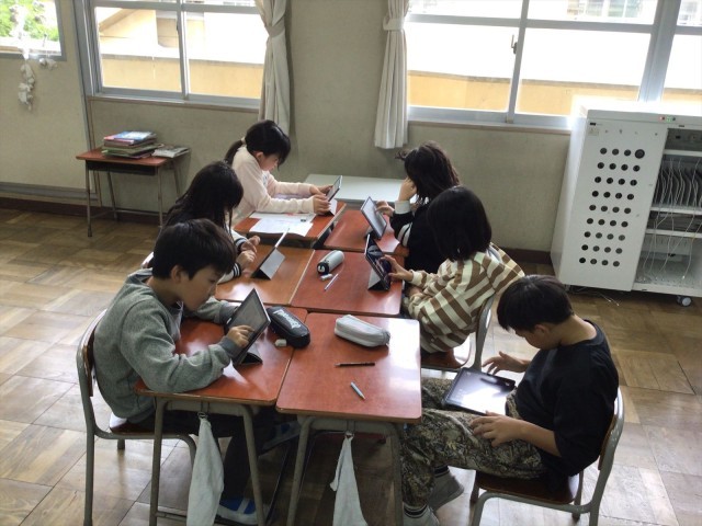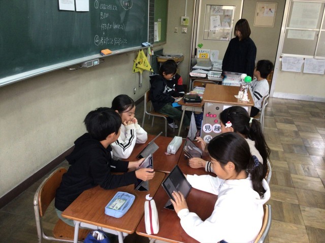 環境についてのグループ学習を進めていました。子どもたちはグループの友だちと協力して、ポスターを作ったり、インターネットや本などで詳しく調べたり、調べたことをタブレット端末でまとめたりと、頑張って学習していました。