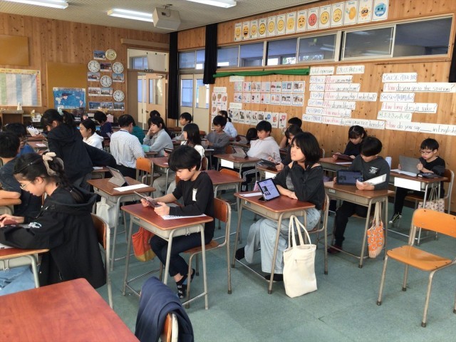 イングリッシュルームでの学習の様子です。子どもたちは英語での発表の前に、3分間の練習をしていました。