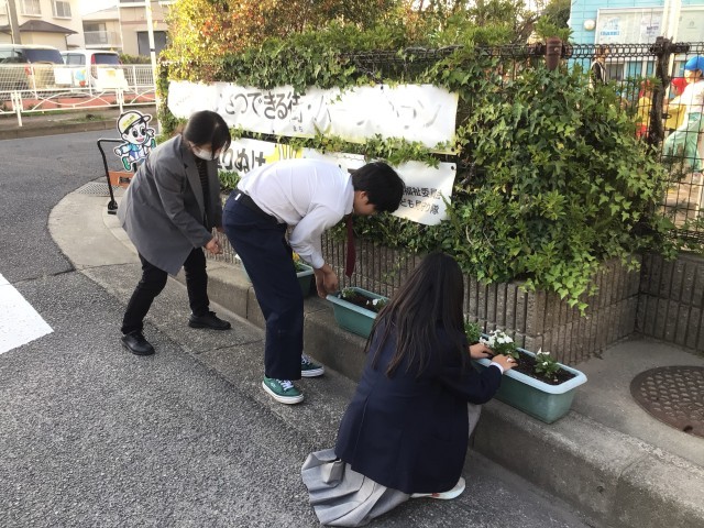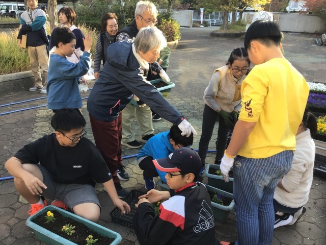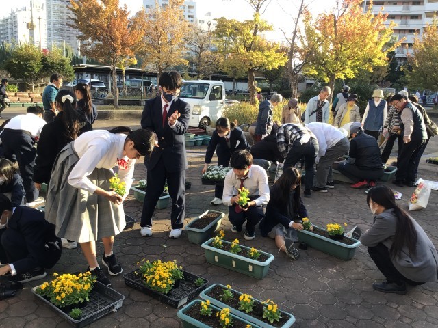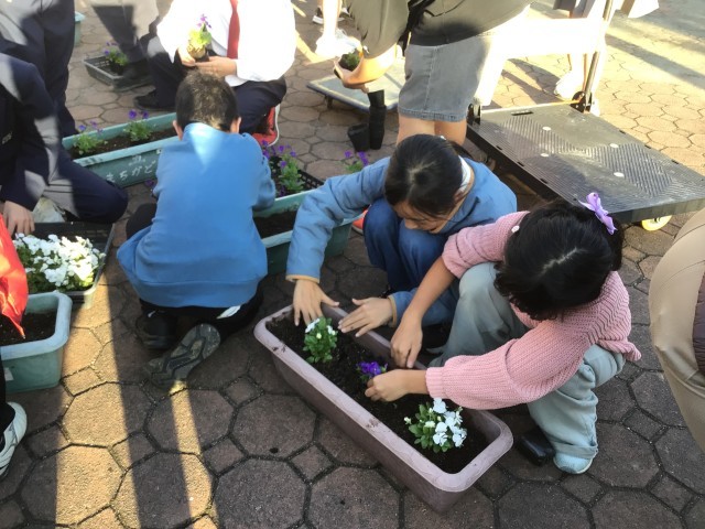 「パークタウンをお花いっぱいの町にする」取り組み、「まちかど学級園」が行われました。地域の方が土を入れてくれたプランターに、集まった前期と後期の児童生徒でパンジーを植えました。その後、花のプランターを地域に配達しました。花いっぱいになあれ。