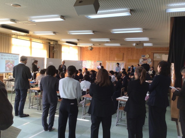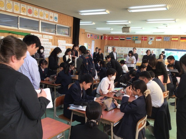 12月2日(火)の5限目に、8年生で、大阪府英語推進事業に係る公開授業が行われました。当日は大阪府教育委員会をはじめ、遠くは京丹後市から、また大阪府内から合わせて30人近くの中学校の先生が来校されました。生成AIを活用した授業後には、活発なグループ討議が行われ、授業での生成AIの活用への関心の高さがうかがえました。8年生はいつもと違う雰囲気に緊張していましたが、「動物と環境」という難しい課題に対して自分の意見をしっかり相手に伝えていました。