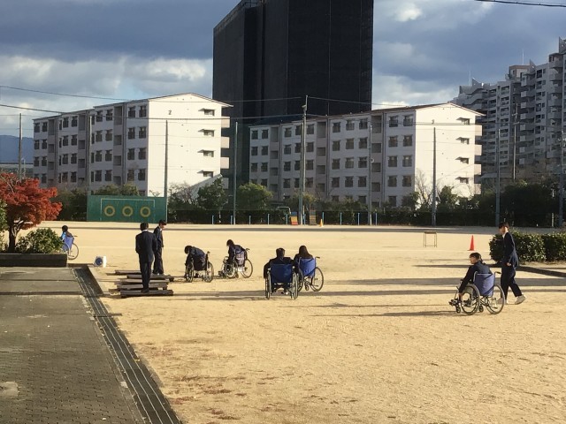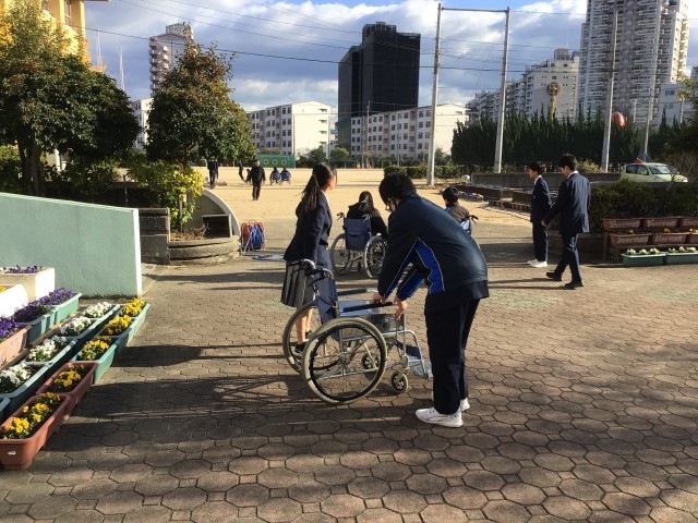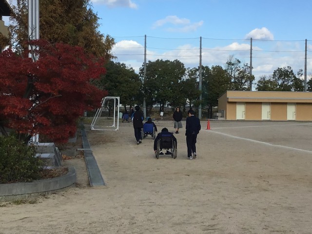 7年生の総合学習で車いす体験を行いました。校舎周りを車いすで自走し、土にタイヤがはまったり、段差で進めなくなったりすることを体験しました。一周周り終わった後は、腕がぱんぱんになったとのことです。