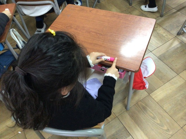 今日はいくつ分の学習をしていました。机の縦と横の長さが、鉛筆や消しゴムなどの文房具がいくつ分になっているのかを調べて、長さ比べをしていました。そして、「机の横の長さは、机の縦よりも1つ分長い。」などと説明をしていました。